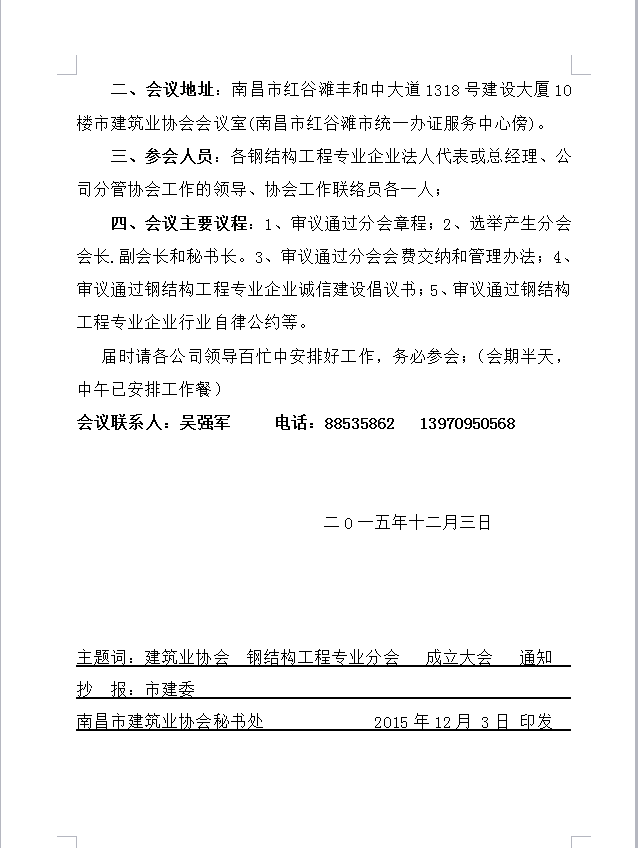 关于召开南昌市建筑业协会钢结构工程专业分会成立大会的通知