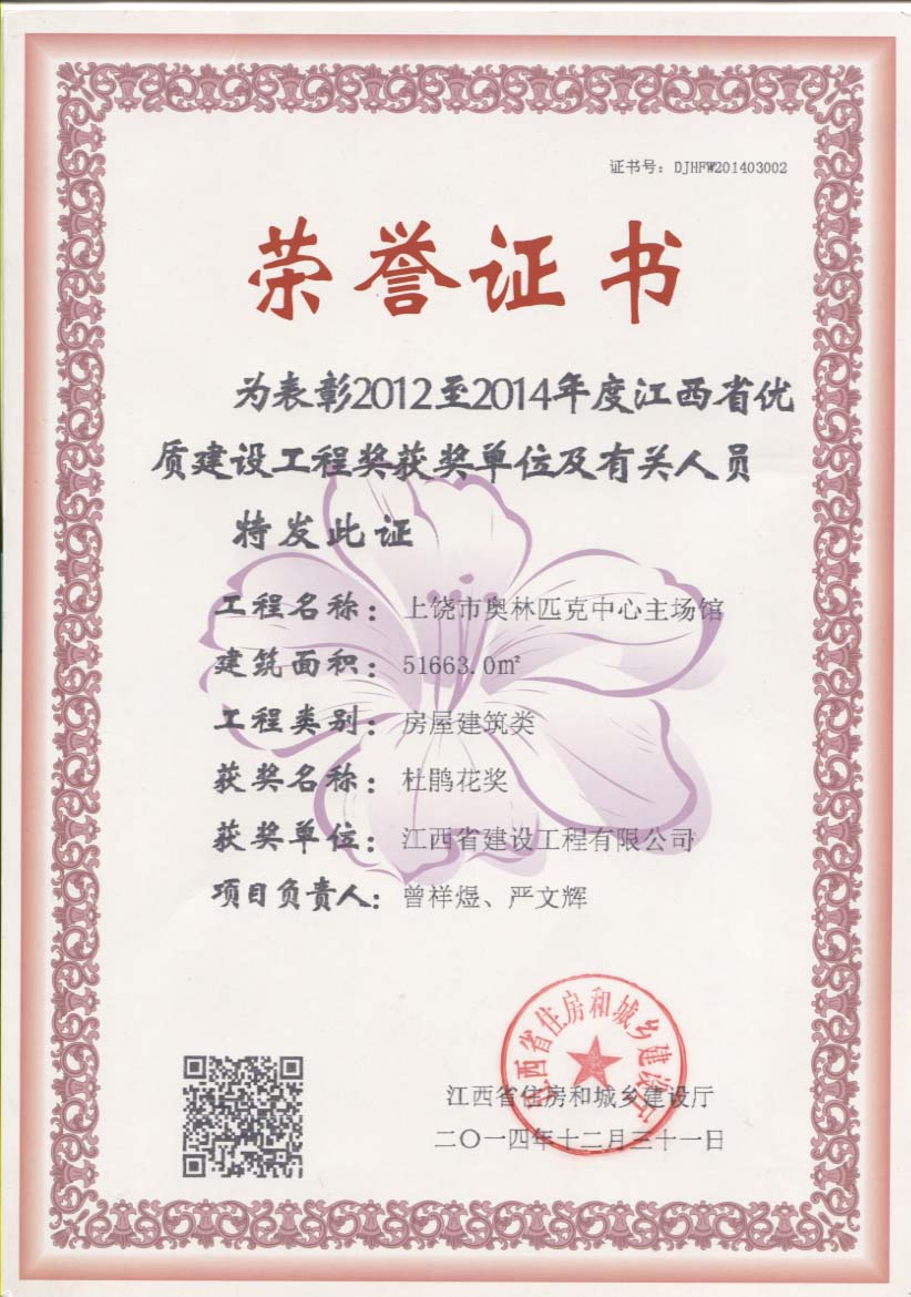上饶奥体中心主场馆项目荣获“江西省优质工程杜鹃花奖”